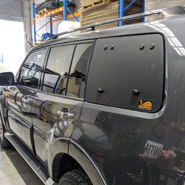 Solid Panel Option: Black powder-coated aluminium, precision-shaped to suit the Gen 4 Mitsubishi Pajero. Tough, sleek, and secure — ideal for off-road and everyday use.