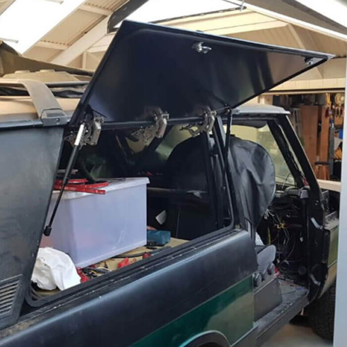 DIY Emuwing Gullwing Window Kit for Range Rover Classic 2 Door – proudly designed and made in Australia. Dustproof, waterproof, and gas strut assisted, with a solid black powder-coated panel for secure, easy side access to your cargo.